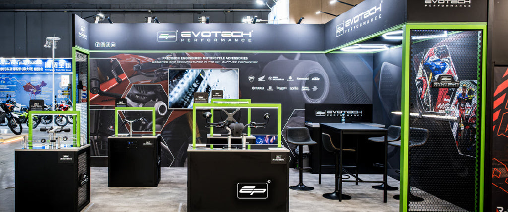 As first-time exhibitors, Managing Directors Chris Vines and Dan Rack, along with Evotech Sales Manager Garry Twigg and Visual Media Whizz Mike Jerrold, left EP HQ in Alford Lincolnshire, with measured expectations but a clear intention: engage the Evotech brand with current and new trade dealers and customers. Showcasing the premium quality design, materials and engineering of our UK-made motorcycle parts and accessories, the Evotech Performance stand was a curated collection of EP’s signature parts and best-sellers.
